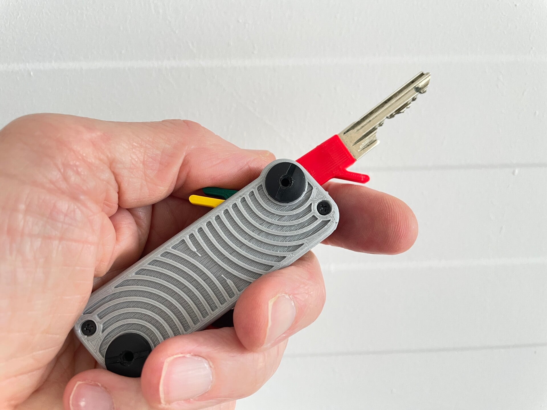 Door de verspringende nokjes aan de sleutels kun je met je duim een gewenste sleutel in de juiste orientatie naar voren draaien en met 1 hand je slot openen. Handig als je andere arm bezet is door bijvoorbeeld een baby, tas of iets dat je niet wilt loslaten.